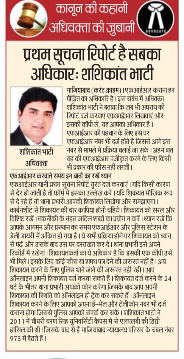 प्रथम सूचना रिपोर्ट (FIR) है सबका अधिकार :– शशिकांत भाटी एडवोकेट 30/05/2020